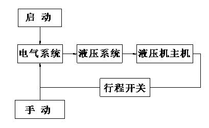 從上面的控制順序框圖可以看出,龍門式雙柱液壓機的工作原理由電氣控制系統(tǒng)控制液壓系統(tǒng),液壓控制系統(tǒng)再控制主機工作,主機動作觸及行程開關(guān),將信號反饋給電氣控制系統(tǒng),實現(xiàn)循環(huán)控制。